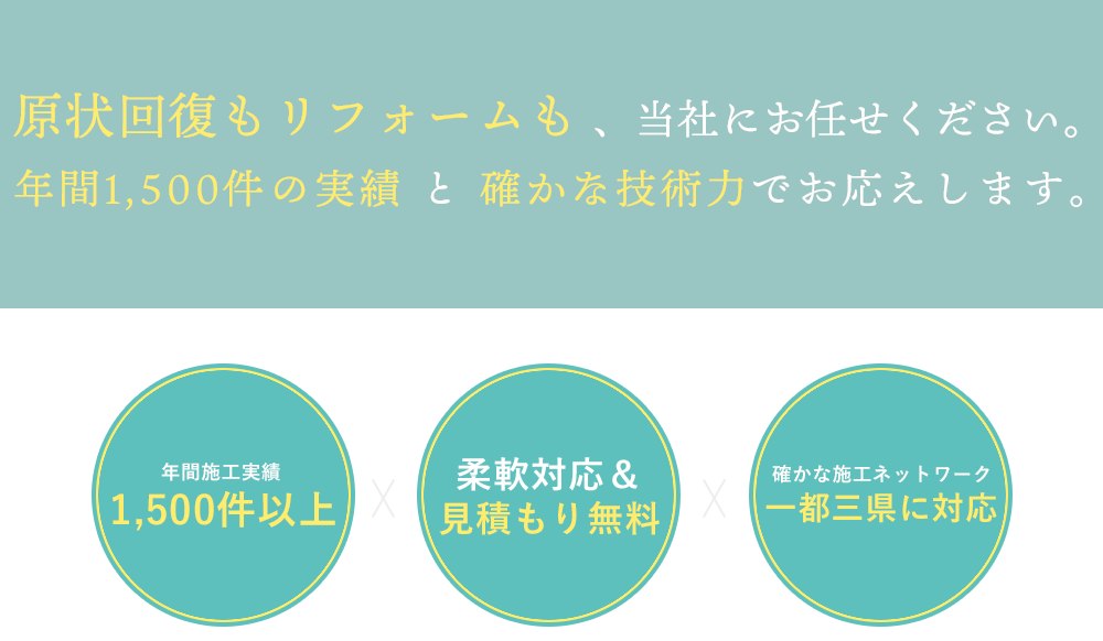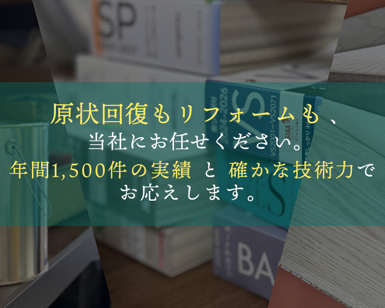 原状回復からリフォーム工事まで、年間1,500件を超えるご依頼をいただいています。不動産オーナー様や管理会社様との長年にわたる信頼関係こそが、当社の最大の財産です。戸建住宅・マンション・オフィス・店舗など、多種多様な物件で培った確かな技術とノウハウで、お客様のご要望にお応えします。